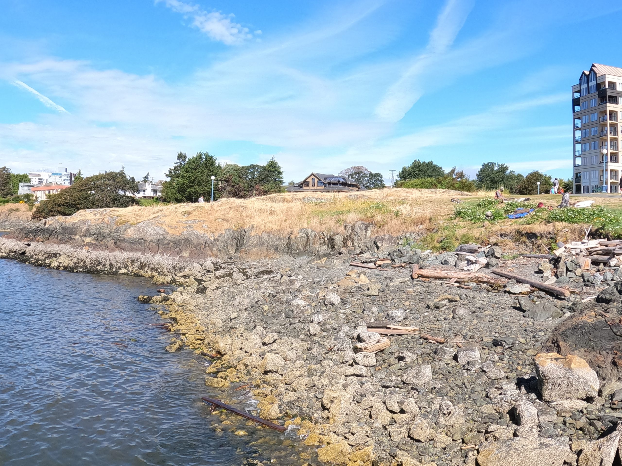 The Songhees Walkway Pocket Beach, lying in what was recently announced as one of the most polluted coastal waterways in the country, holds significant cultural importance within the traditional territories of the lək̓ʷəŋən (Lekwungen) People, known today as Songhees and Esquimalt Nations. Once a bustling hub of cultural activities, it was a place where guests were warmly welcomed in the traditional Salish manner. This area was vital for launching and landing traditional watercraft, such as Western red cedar dugout canoes, owing to its sheltered and productive shorelines. Teeming with thriving kelp forests, shellfish communities, and eelgrass meadows, it was an ideal spawning ground for forage fish like Pacific herring, Pacific sand lance, and surf smelt.